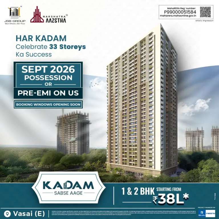 Nakshatra Aazstha is a 33-storey residential high-rise in Vasai, offering safe, thoughtfully planned, and eco-friendly living spaces with modern amenities, elegant design, and an environment where families can truly feel at home.