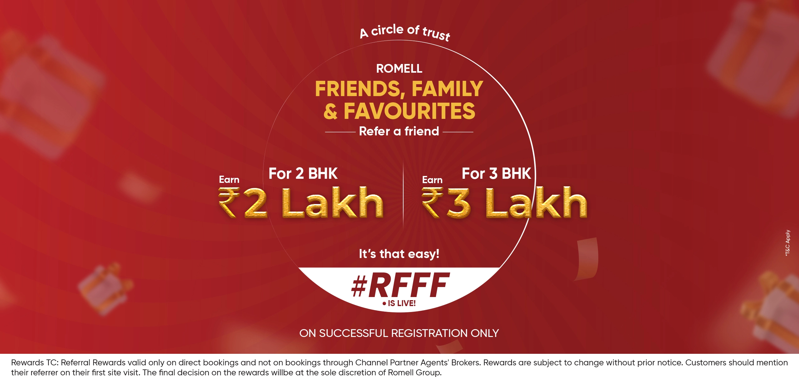 Invite your friends, family & favourites to experience the Romell lifestyle. when they book a home, you get rewarded up to rs 3 lakhs. Because great communities are built with people you love living just around the corner.